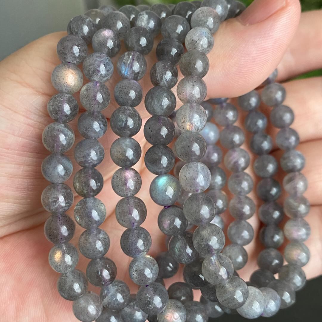 ラブラドライト特有のラブラドレッセンスが見られます。通常ブルーのレッセンスが多いのですが、こちらはピンクパープル、ベージュのラブラドレッセンスが各粒に見えます。各粒の色味も揃っておりとても綺麗です。