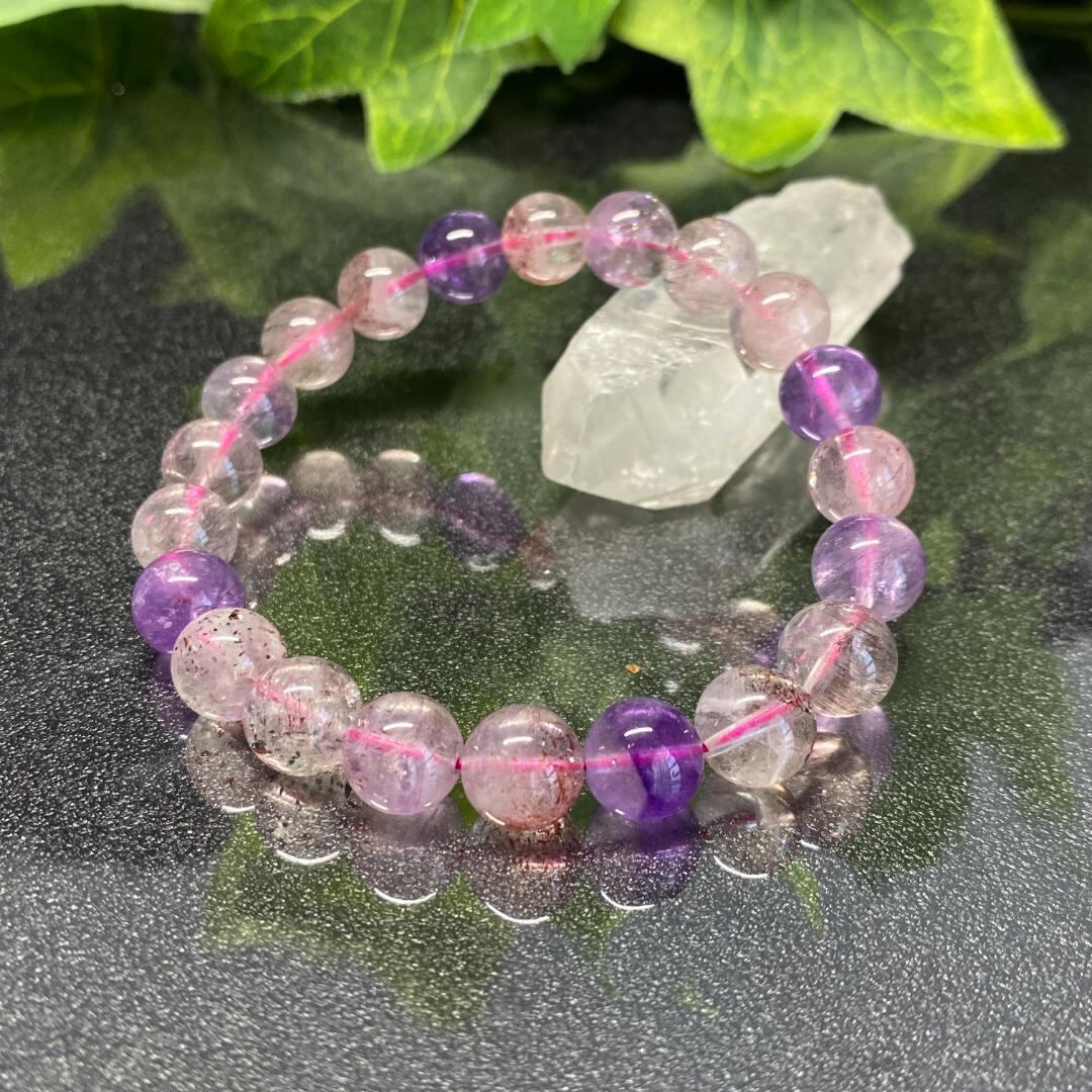 スーパーセブンは、水晶の中に複数の鉱物が内包された天然石で、構成する7種類の鉱物が入ります。水晶、アメジスト、カコクセナイト、ゲーサイト、レピドクロサイト、スモーキークォーツ、ルチルクォーツが共存・調和しています。