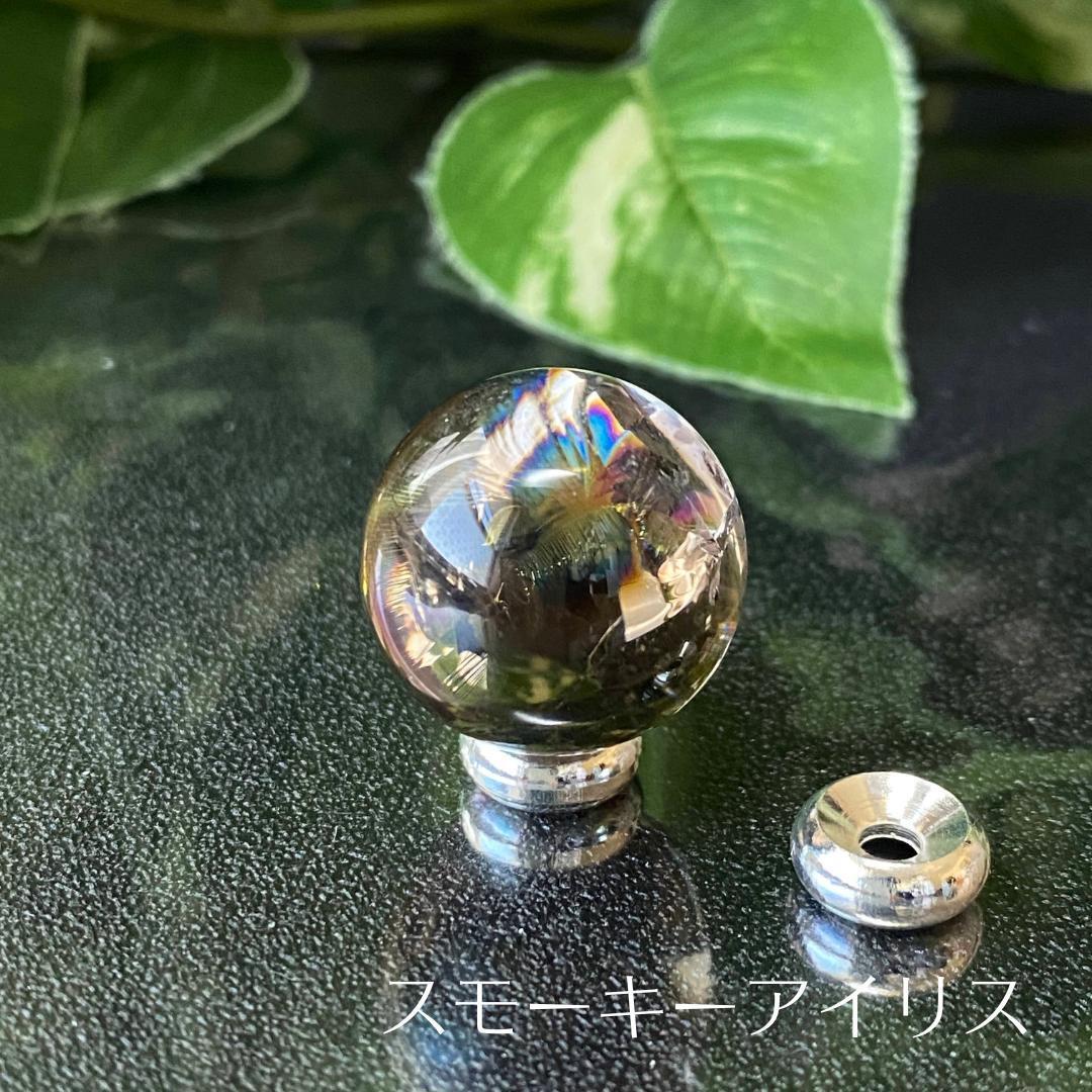 強く光る虹が入るスモーキーアイリスクォーツのスフィア(丸玉)になります。